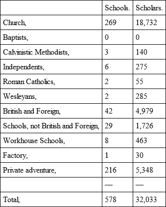 "Still, so far as daily education has hitherto been supported by voluntary payments, this has been mostly in connexion with the church. For, putting aside 31·1 per cent of the day-scholars as belonging to private adventure schools, and 10·9 percent for children in union workhouse and workmen's schools, there remains 39·9 per cent of the day-scholars in connexion, and 18·1 per cent not in connexion, with the church."