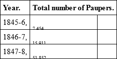 The total number of paupers relieved in the city of Glasgow and suburbs in the year 1848-9 was 122,000; being exactly a third of the population receiving parochial relief.