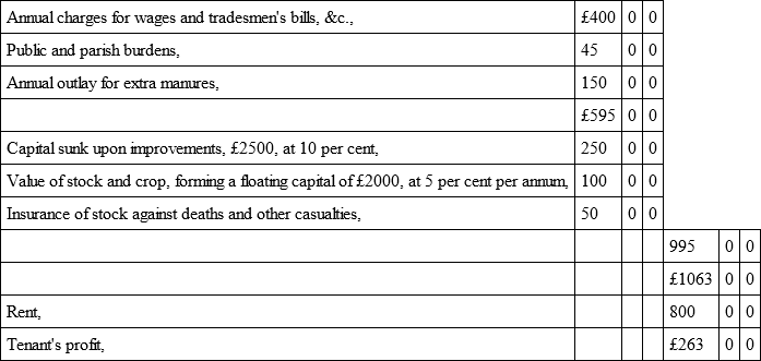 In all, excepting in regard to the value of live stock, or produce of grass and turnips, we nearly agree; and this difference may be accounted for, because no part of farm produce varies so much in its return as that of the live stock. Upon such a farm as that which is taken as an example, sheep and cattle are not wholly reared upon the farm, but part are bought in to fatten; hence the returns depend upon three circumstances, – 1st, upon the crops of turnips and grass being less or more abundant; 2d, upon the price of lean stock; and, 3d, upon the price of fat. While, therefore, the butcher market may be very high, the feeder may not necessarily be well paid, – and hence, in making up returns under this head, a correct average is not easily ascertained; and as there must always be a difference of opinion among practical men upon this part of the subject, I think, for publication, Mr Dudgeon's method of stating the returns in one sum is preferable to giving them in detail.