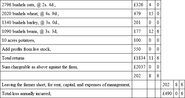 Let those who believe that, by high farming, the soil can be stimulated so as to produce enormously augmented crops, at a large additional profit, consider the above statistics well. They are the statistics of the very highest farming in Scotland. The English agriculturist has been taunted for his backwardness in not adopting the improvements of his northern neighbour, who, with a worse climate, has made the most of the soil. Such has been the language used by some of the advocates and apologists of free trade, who are now urging the farmer to lay out more capital in draining and manures – assuring him that, by doing so, the returns will far exceed the interest of the outlay. With a fine disregard for the elements of arithmetic, they insist that low prices can in no way interfere with his success, and that only exertion and enterprise are wanting to raise him above the reach of foreign competition. The above tables exhibit the experiment, worked out to its highest point. In these cases capital has been liberally expended, energy tasked to the utmost, and every means, which science can devise or experience suggest, called into active operation. The farmers of Mid-Lothian, Berwickshire and Forfarshire may fairly challenge the world in point of professional attainments. They have done all that man can do, and here is the reward of their toil.