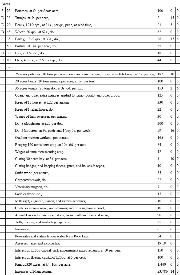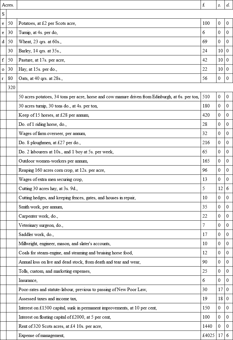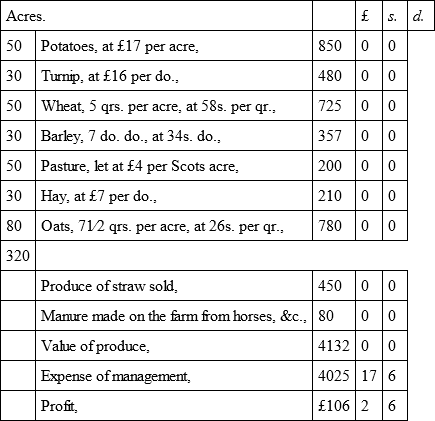 Valuation of Produce, and Expense of Management of a Farm of 320 Scots acres, situated within five miles of Edinburgh, on an average of seven years previous to potato failure in 1846, and farmed according to the four-shift rotation, the straw being sold in Edinburgh, and dung bought. The produce is a fair average of the best-managed farms within five miles of Edinburgh, during the period from which the average is taken. The prices noted are what were realised, being about 3s. 6d. per qr. above the average prices of the county, and the expense of management charged is what was actually paid.