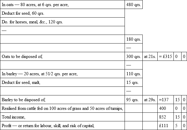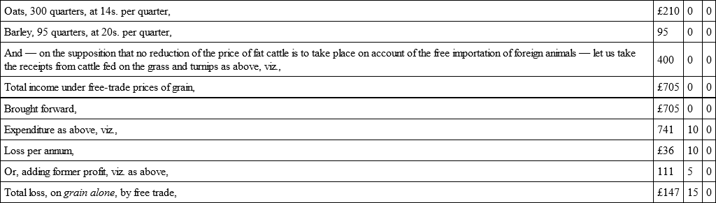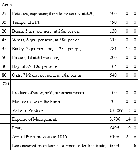 I consider the above a fair statement of the expenditure and income on a farm in the lower district of Aberdeenshire, under former and under present circumstances. It will be observed that no wheat is grown; but the soil is well adapted for the rearing and feeding of cattle, and from this source the Aberdeenshire farmer expects to derive a large proportion of his returns. In the comparison, reference is had solely to the fall in the price of the kinds of grain cultivated. Whatever decline in the price of fat cattle may arise from free trade, will fall heavily on the farmers of this district; and the reduction of income thus occasioned will, of course, add to the amount of loss shown above.