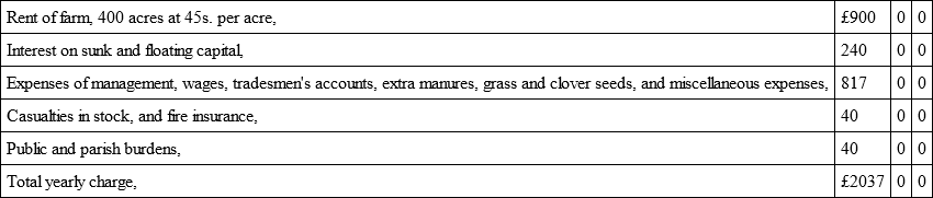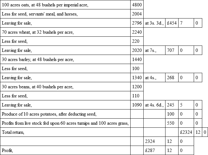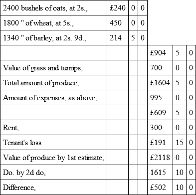 "I think Mr Dudgeon makes too little allowance for stock and insurance, (£50.) Mr Watson's allows double, (£100,) which is low enough. Some of my neighbours here have lost from £200 to £300 by pleuro-pneumonia upon cattle alone, independent of other stock. I also think they are both wrong in the average quantity of grain grown. It may be done upon a farm of good land, in high condition, but – I mean taking a whole county – it is, I think, above the mark. For example, 1836, 1837, 1838, 1839, 1840, 1841, being six years running, with as fine appearance of wheat as I ever grew, I did not average twenty-six bushels per acre, weighing 64 lb. to 65 lb. per imperial bushel, in these six years. I considered my loss equal to 2000 bolls wheat below a fair crop, all in consequence of the fly." – (JOHN THOMPSON, Craigie, Leuchars.)