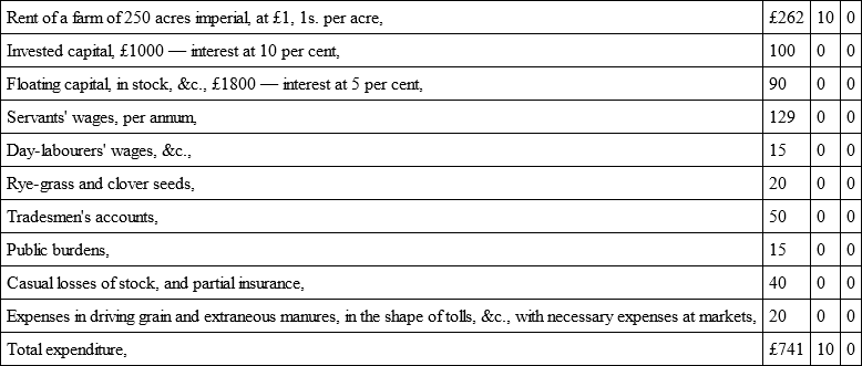 [We ought, perhaps, to explain that this case is peculiar. It is that of a first-class farm in the neighbourhood of Edinburgh, attested by men of the same standing as its tenant, and similarly situated; the average of the produce is very high, and the rent corresponding. Mr Gibson, the tenant farmer, has taken the details of the following statement from his books; so that it becomes of much value, as showing the statistics of farming in the immediate vicinity of the metropolis of Scotland. In estimating the productiveness of this farm by the extent of the yield, our English readers must bear in mind, that it is divided by the Scots and not the imperial acre as in the other estimates, the former being one-fifth larger. It will be allowed, on all hands, that the yield of this farm is extraordinary.]
