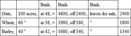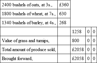 "I was favoured with your letter and enclosure of the 8th inst. I have gone carefully over the statements of the working of a farm, and the quantity and value, at present prices, of the produce – all of which appear to me to be fairly stated. I have drawn up a statement of the returns of produce of a 400 acre farm in Mid-Lothian, which, if it meets your approval, you are at liberty to publish along with the others. The prices of the grain which I have assumed are in some instances higher than those of Messrs Dudgeon and Watson; but I think this can be explained, by the farm being situated in the neighbourhood of the best market." – (THOMAS SADLER, Norton Mains, Ratho.)