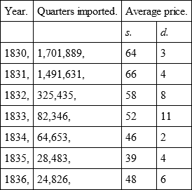 Secondly, it is not true that the last wheat crop was the largest ever known in England. This is a wild and utterly extravagant assertion. The bygone crop was a good one, less on account of quality than of gift; but every agriculturist knows that, within the experience of the present generation, we have had far finer crops. That of 1815 was enormous in its yield – so great that we did not import a single quarter of grain, and the average price of wheat for that year was 63s. 8d. The crop of 1822 was not very much inferior. These are notorious instances; but in order to ascertain, with as much precision as possible, the relative quality of the bygone crop, we submitted the statement of Mr. Gladstone to one of the most extensive corn-dealers in Leith, and the following is his reply. "Mr. Gladstone's statement is certainly very unlike that of a person of his high authority; though I conceive it as calculated to do much mischief in the present depressed state of the corn-trade, as many people will judge of it from Mr. Gladstone's high standing. In my opinion, however, nothing can be more absurd than estimating a crop by a yard in any field, or by a single acre. We hear now a great deal of the land being more productive, by draining and other improvements; and it was to be expected that, when a good wheat season occurred, we should have more wheat than in previous years; but, from all the confirmation we have yet obtained, I am by no means disposed to believe that the last crop is a great one, far less that it is greater than ever known. The present generation, I have no doubt, have seen larger crops of wheat than our forefathers; but I think 1814, 1815, 1822, 1825, 1831, 1832, 1833, 1834, 1835, 1841, and 1842, were better seasons than the last. Essex, and several other English counties which had bad crops in 1848, have much greater crops in 1849; but Lincolnshire, and several other very important counties, have very deficient crops on certain varieties of soil. All that can be said of the present crop is, that it is a full one, generally speaking. More of it, I am sure, will yield under 40 bushels an acre than over 40; and very little, indeed, 60 or 68, as Mr. Gladstone says a single acre has produced." So much for the general yield; let us now revert to the seasons which Mr. Gladstone has selected for comparison.
