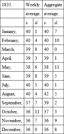 The first remark that we shall make with reference to this statement, is, that it is utterly incorrect. We do not know from what source Mr Gladstone ordinarily draws his figures, but if any one will consult the official tables of returns for the year 1835, he will find that the average of wheat was 39s. 4d., and not 35s., as Mr Gladstone has unwarrantably asserted. We have gone over the weekly averages for the whole of that year, and we find that wheat was never once quoted so low as 35s. In a matter of this kind, accuracy is a cardinal virtue, and we cannot allow such a statement as this to pass unnoticed. The following are the lowest weekly and aggregate averages for the whole year, taken from the official tables, and we have purposely selected these in order that Mr Gladstone may have the full benefit of the nearest approximation to his figures.