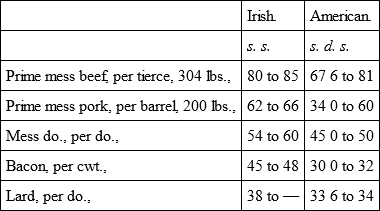 "American beef is far superior to Irish, and brings more money. The import of the latter is about 1000 tierces – of the former, 20,000 tierces. Irish pork stands higher than American, and the finest quality eastern will sell within 5s. per barrel of Irish. The import of Irish is about 3000 barrels – of American, 35,000 barrels."