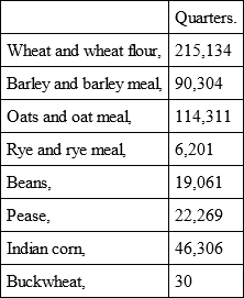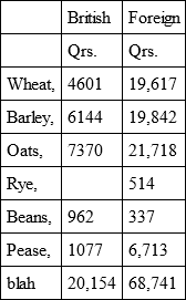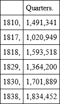 If anything could make us lose our patience, while dealing with so momentous a subject, it would be the sight of such statements as these. Observe how the matter stands. Mr Gladstone is arguing that importations from abroad do not affect prices here, and, by way of proof, he gives us the statistics of a single month. He says – Last October you had good prices and large importations: this October you have bad prices and diminished importation. Ergo, importations have nothing to do with prices! Is Mr Gladstone ignorant of the fact, that, for the first eight months of the year 1849, the quantity of grain imported was more than double that of the preceding season, and that almost every warehouse in our ports is filled almost to bursting with foreign grain? Is he aware that this diminished import for October, if extended over the year, would give an amount greater than was brought in during any famine year previous to 1839? Let us see how this matter stands, adopting his very favourable calculations.