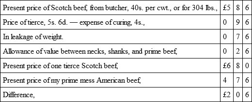 "In reply to the queries put to me by you, as to the value, &c. of foreign provisions, I beg leave to hand you a statement of the difference of price of Scotch and American beef, calculating the Scotch beef at the present low price of 40s. per cwt., and the present price of my American prime mess beef at 87s. 6d. per tierce of 304 lbs., the quality of which is not inferior to the best Scotch beef.