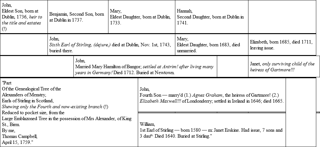 III. The De Porquet Packet. With every disposition to treat this item of evidence with the gravity and impartiality befitting quasi-judicial investigation, we acknowledge feeling extreme difficulty in doing so. To us, as English lawyers, intense would seem the simplicity of those expecting any rational being to give credit for an instant to the contents of this astonishing packet, as genuine. Two months after the judgment of the Lord Ordinary, pointing out the fatal flaw in the prisoner's pedigree – (viz., the non-proof of two particular steps in that pedigree – that John No. 3 descended from John No. 2, and the latter from John No. 1,) a sensitive and conscientious thief died – viz. in March 1837 – in the exact nick of time, having kept by him till that sad event a packet which he had purloined from his employer in 179844 i. e. for forty years; and which packet contained four family documents, of vital moment, applying themselves with miraculous exactness to the deficiency in the pedigree aforesaid! We are here stating shortly, but correctly, the effect of a document under this head of the charge, set forth in the indictment. That document we gave verbatim in our last Number.45 Messrs De Porquet, London booksellers, received a packet by the penny post, on opening which they found one addressed to Lord Stirling, accompanied by a note from a "Mrs. Innes Smyth," (of whom no one has hitherto seen, heard, or known anything whatever,) requesting them to send it to his lordship; whose son happening in the month of April 1837 —i. e., a few weeks after the opportune death of the mysterious thief – to call at Messrs De Porquet, they gave him the packet addressed to his father. Instead of at once forwarding it to him, the young gentleman instantly took it to his solicitors; and after an exciting colloquy as to what this packet might contain, (the idea never occurring to him, that it would be the proper formal course to send it off to his parent according to its address,) it is arranged that they should go on the ensuing morning to a notary public, and open the packet in his presence! This was done; on which they discovered the interesting document above referred to, explaining the theft of the packet which it accompanied, cased in parchment, sealed with three black seals, "evidently," said the young Alexander, in his letter to the prisoner, "my grandfather's seals – not like those we have" – and with the following words, also instantly recognised as being in his grandfather's handwriting, on the packet – "Some of my wife's family papers" – that wife being the prisoner's mother, Hannah, daughter of John No. 3 (the Rev. John Alexander,) the "person of such great humility, and so perfectly unostentatious," according to her daughter's statement,46 "that she did not take upon herself the title of Countess, though she often told her children that they had noble blood in their veins; – that she had two brothers, 'John' and 'Benjamin,' who had fully intended assuming their peerage honours, but for their premature death —unmarried!– whereby she," the lady aforesaid, "believed herself the last of the family of Alexander who were entitled to be Earls of Stirling!" The sheet of paper accompanying this mystic parchment packet had a black border, "owing to the death of the thief!" – who "had never dared to break the seals" – the threefold seals of the packet – "which accounts for the admirable state of preservation" in which the contents were after this forty years' interval!!!47 This inner packet the modest notary felt to be of too solemn a character to be opened in his presence; and recommended its being taken for that purpose to a functionary of commensurate solemnity – to wit, a proctor.48 No sooner said than done: away they went to the proctor, with whom they were closeted five hours; and in whose presence – and that "of four witnesses" – the young gentleman ventured to cut the parchment over the middle black seal – and there appeared four enclosures which completely settled the business in favour of the claimant of the Stirling peerage. Never was anything so beautiful in aptitude. First, was a genealogical tree – thus: