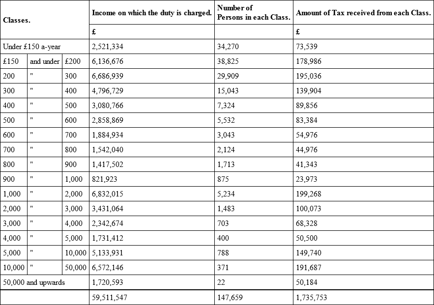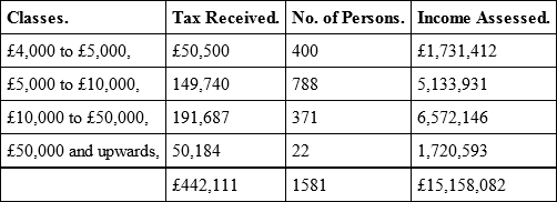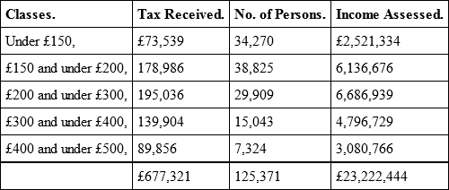 To illustrate the extreme injustice of the Income Tax, and the way in which it presses on the most industrious and hard-worked, as well as important class of the community, we subjoin a Table of Schedule D (Trades and Professions) for the year ending 5th April 1848; and we take that year in preference to the subsequent ones, to avoid the objection of the commercial crisis of 1848 having rendered the view partial and deceptive.61 From this important Table it appears that the sums received from persons under £500 a-year were —
