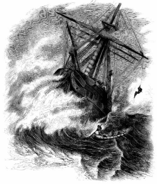 We say safely, for, whenever any one of these indomitable sea-kings, no matter in what circumstances of difficulty or danger, gets a rope that is well secured at its point of suspension, fairly within his iron gripe, we may at once dismiss all concern about his personal safety. In this case the intrepid adventurer, when he found that the boat had surged away from beneath him, and left him suspended in the air over the raging and foaming billows, felt that all danger was over. To mount the rope, hand over hand, till he gained the yard-arm, to clamber up the yard to the mast, and then to descend to the deck by the shrouds, required only an ordinary exercise of nautical strength and courage. All this was done in a moment, and Mr. Holmes stood upon the deck, speechless, and entirely overcome by the appalling spectacle of terror and distress that met his view.