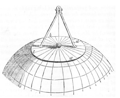 "At the centre of the dome of the Panthéon a fine wire is attached, from which a sphere of metal, four or five inches in diameter, is suspended so as to hang near the floor of the building. This apparatus is put in vibration after the manner of a pendulum. Under and concentrical with it, is placed a circular table, some twenty feet in diameter, the circumference of which is divided into degrees, minutes, &c., and the divisions numbered. Now, supposing the earth to have the diurnal motion imputed to it, and which explains the phenomena of day and night, the plane in which this pendulum vibrates will not be affected by this motion, but the table over which the pendulum is suspended will continually change its position in virtue of the diurnal motion, so as to make a complete revolution round its centre. Since, then, the table thus revolves, and the pendulum which vibrates over it does not revolve, the consequence is, that a line traced upon the table by a point projecting from the bottom of the ball will change its direction relatively to the table from minute to minute and from hour to hour, so that if such point were a pencil, and that paper were spread upon the table, the course formed by this pencil would form a system of lines radiating from the centre of the table. The practiced eye of a correct observer, especially if aided by a proper optical instrument, may actually see the motion which the table has in common with the earth under the pendulum between two successive vibrations. It is, in fact, apparent that the ball, or rather the point attached to the bottom of the ball, does not return precisely to the same point of the circumference of the table after two successive vibrations. Thus is rendered visible the motion which the table has in common with the earth."