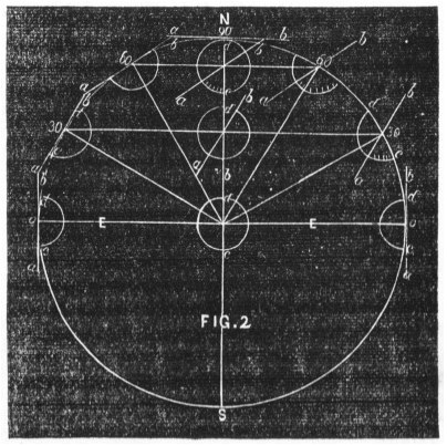 Fig. 2 represents the earth or a globe revolving once in twenty-four hours on its axis (s n). It is divided, on its upper half, by lines parallel to each other, representing the latitudes 60 degrees, 30 degrees, and the equator, where the latitude is nothing. The lines a b, at 90, 60, 30, and 0 represent the planes of those latitudes; or, in more familiar terms, tables, over which a pendulum is supposed to vibrate, and moving with them in their revolutions round the axis (s n). This being clearly understood, the next object is to show how the pendulum moves round the tables, for each of the latitudes; also to show the gradual diminution of its circular motion as it approaches the equator (e e), where, as was before observed, the latitude is nothing.