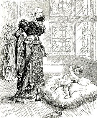 The witch at length had her desire, for witches often get what they want: a splendid boy was born to the fair Aurora. Just as the sun rose, he opened his eyes. Watho carried him immediately to a distant part of the castle, and persuaded the mother that he never cried but once, dying the moment he was born. Overcome with grief, Aurora left the castle as soon as she was able, and Watho never invited her again.
