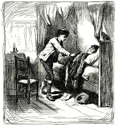 Whereupon they carried him up stairs, and along a passage, to a small room at the farther end, and laid him on a bed just as he was. Having struck a light, André was about to leave the room, when he was detained by the other.