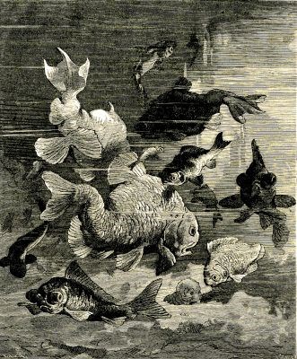 Although the fish draw nourishment from animalcules supplied by the water, and will live a long time without other food, it is advisable to feed them by throwing bread-crumbs, or flies and other small insects, on the surface of the water. The eagerness with which they dart for them proves them to be welcome. Care should be taken not to scatter more bread-crumbs than will be immediately eaten, for bread sours very quickly, and renders the water impure. In changing the water the fish should never be subjected to any sudden variation of temperature, as the shock produced by a violent change from water of medium temperature, which is always best, to ice-cold, might ruin the whole stock of an aquarium in an instant.