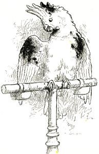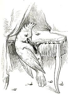 Alas! my ill behavior was sadly punished. The bottle I had overturned was filled with ink, and I was spattered from head to foot with the vile black mixture. My beautiful plumage, of which I had been so proud, was ruined. I was both horrible and ridiculous. In this miserable and forlorn condition I climbed back upon my perch, and in a most wretched frame of mind waited to be discovered, and perhaps punished.