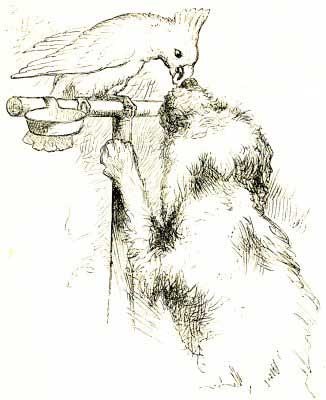 Often when I sat on my perch Fritz would lie on the carpet near me, and we would hold long conversations together. He, too, had met with disappointments in life, and we consoled each other. We shared constantly the good things given us, and I soon discovered that Fritz adored sugar. As there were always some pieces in my feed dish, I kept them for him, and many a frolic we have had, for I never could help tantalizing him by holding the tempting morsel higher than he could jump.