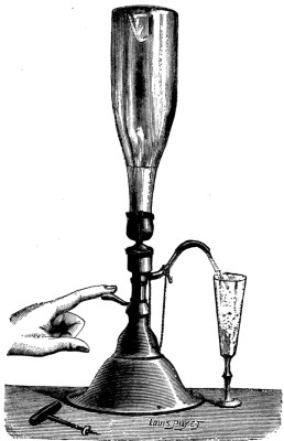 When a bottle of any liquor charged with carbonic acid under strong pressure, such as champagne, sparkling cider, seltzer water, etc., is uncorked, the contents often escape with considerable force, flow out, and are nearly all lost. Besides this, the noise made by the popping of the cork is not agreeable to most persons. To remedy these inconveniences there has been devised the simple apparatus which we represent in the accompanying cut, taken from La Nature. The device consists of a hollow, sharp-pointed tube, having one or two apertures in its upper extremity which are kept closed by a hollow piston fitting in the interior of the tube. This tube, or "tap," as it may be called, is supported on a firm base to which is attached a draught tube, and a small lever for actuating the piston. After the tap has been thrust through the cork of the bottle of liquor the contents may be drawn in any quantity and as often as wanted by simply pressing down the lever with the finger; this operation raises the piston so that its apertures correspond with those in the sides of the top, and the liquid thus finds access to the draught tube through the interior of the piston. By removing the pressure the piston descends and thus closes the vents. By means of this apparatus, then, the contents of any bottle of effervescing liquids may be as easily drawn off as are those contained in the ordinary siphon bottles in use.