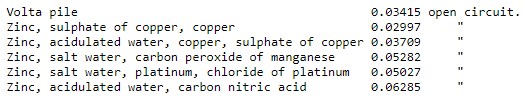 The following numbers represent the potential of an element of the battery–that is to say, the quantity of electricity that the pole of that battery spreads upon a sphere of one centimeter radius. They are expressed in units of electricity, the unit being the quantity of electricity which, acting upon a similar unit at a distance of one centimeter, produces a repulsion equal to one gramme: