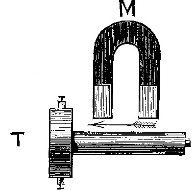 (10) B. G.—In reply to your inquiry as to Mr. Stroh's telephone experiment, we give the following, which we clip from the English Mechanic: A singular experimental effect, of special interest just now from its possible bearing on the theory of the source of sound in the Bell telephone, has just been observed by Mr. Stroh, the well known mechanician. If a telephone, T, with the circuit of its coil left open, be held to the ear, and a powerful magnet, M, be moved gently up and down along the length of the magnet, as shown by the arrow, and at a distance of an inch or two from it, a faint breathing sound will be heard, the recurring pulses of sound keeping time with the up and down motion of the magnet. The sound may be aptly compared to the steady breathing of a child, and there is a striking resemblance between it and the microphonic sounds of gases diffusing through a porous septum as heard by Mr. Chandler Roberts. We understand that Professor Hughes is investigating the cause of this curious sound by help of the microphone.