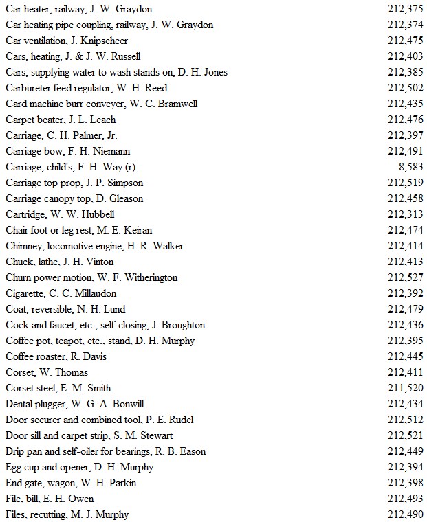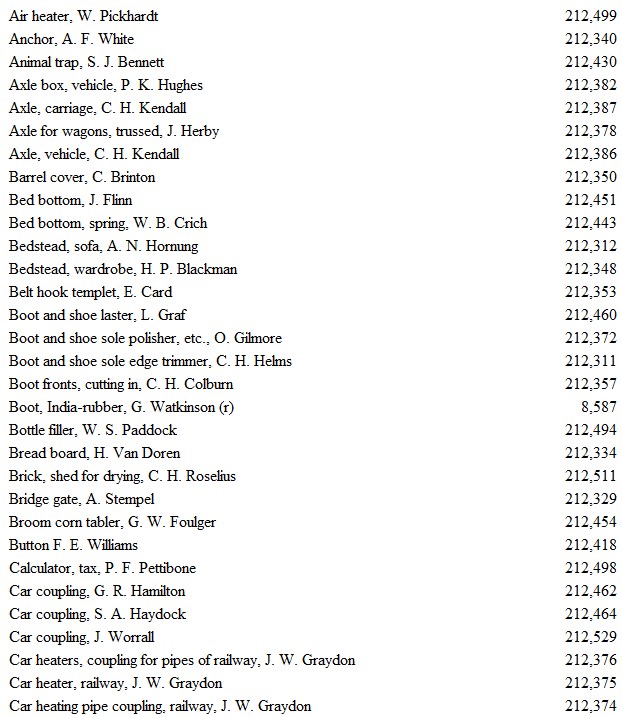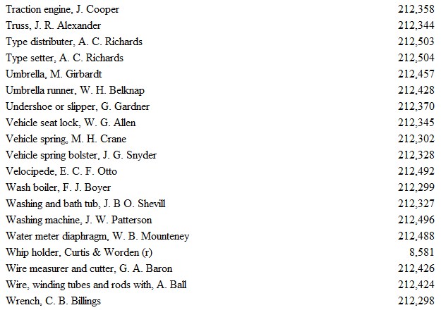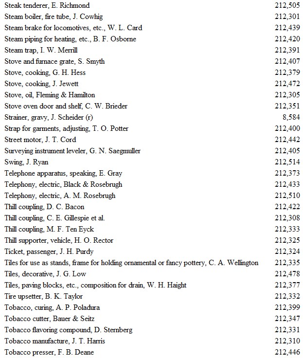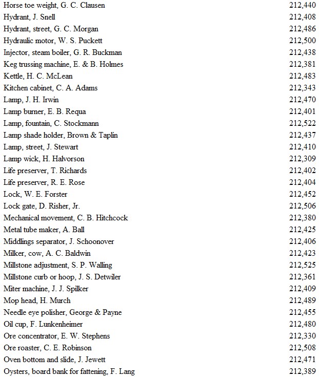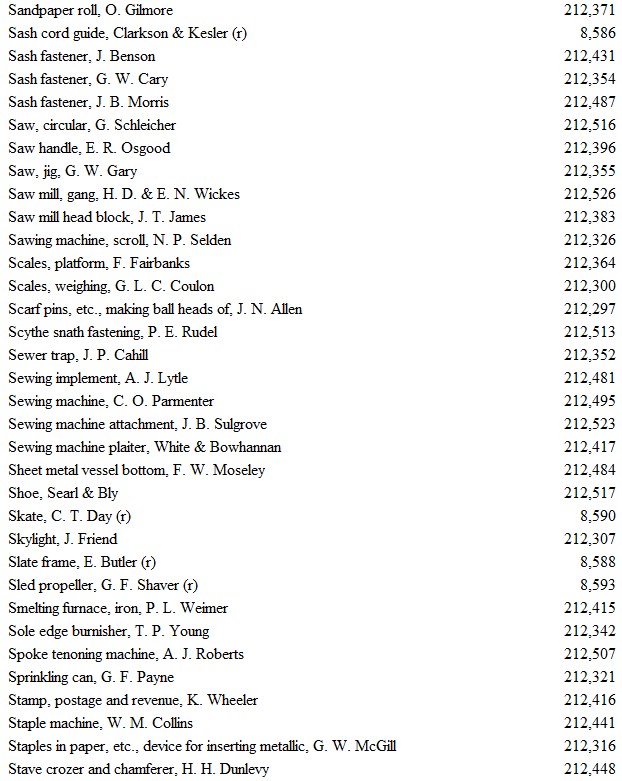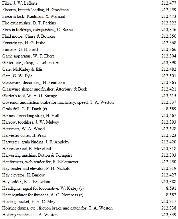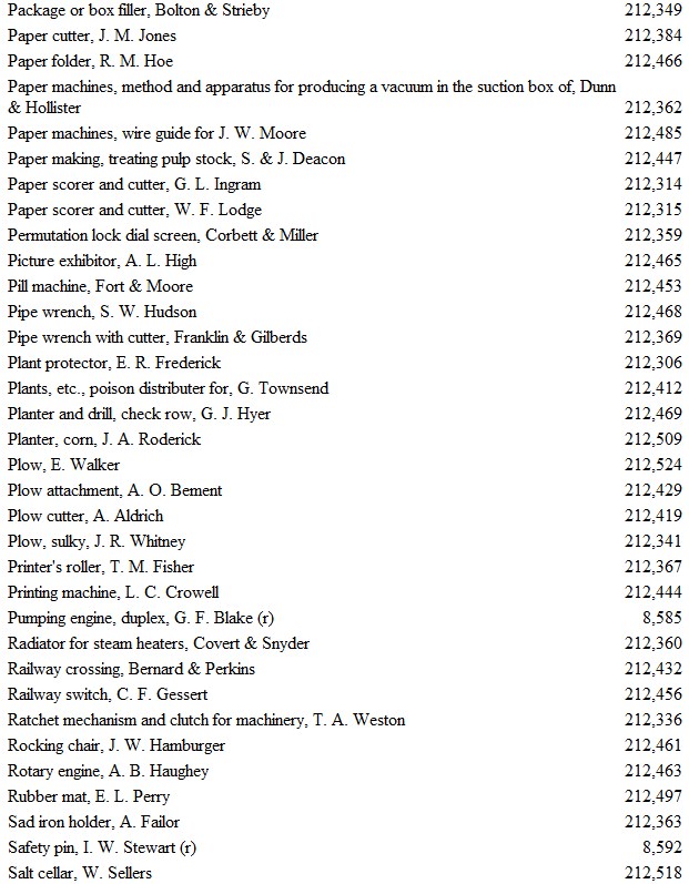 [OFFICIAL.]INDEX OF INVENTIONSFOR WHICHLetters Patent of the United States were Granted in the Week EndingFebruary 18, 1879,AND EACH BEARING THAT DATE[Those marked (r) are reissued patents.]A complete copy of any patent in the annexed list, including both the specifications and drawings, will be furnished from this office for one dollar. In ordering, please state the number and date of the patent desired, and remit to Munn & Co., 37 Park Row, New York city.