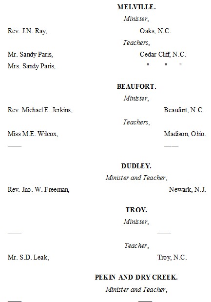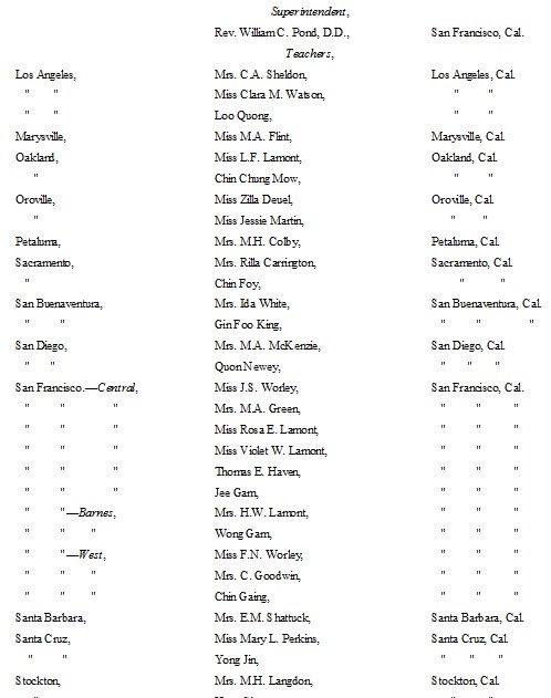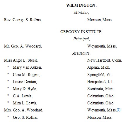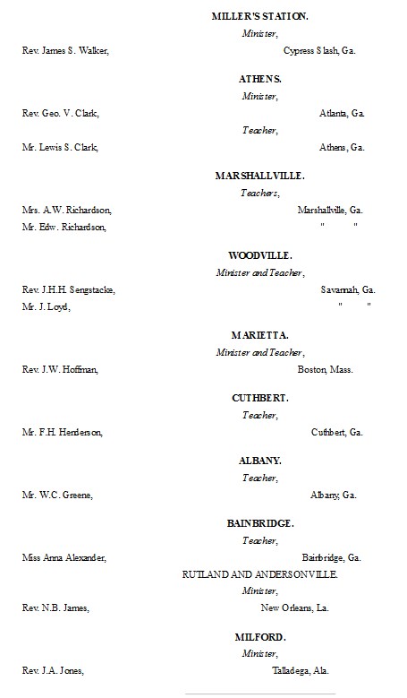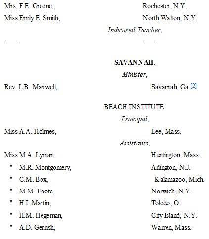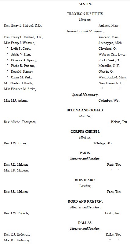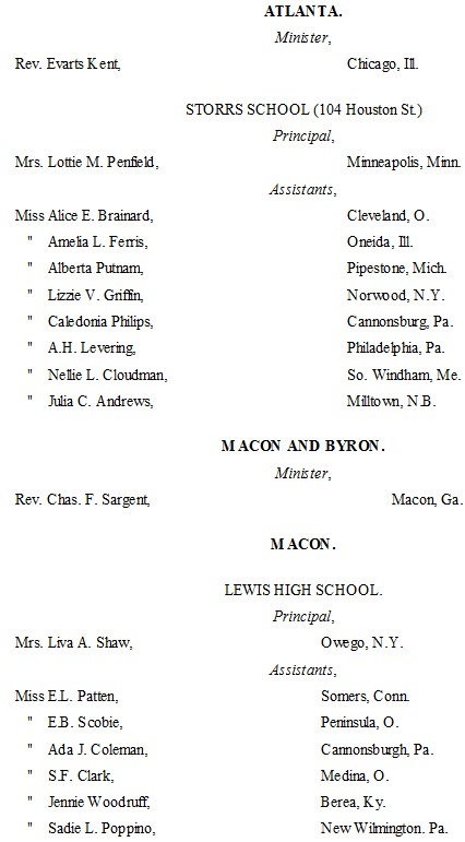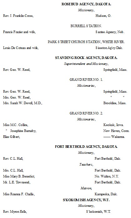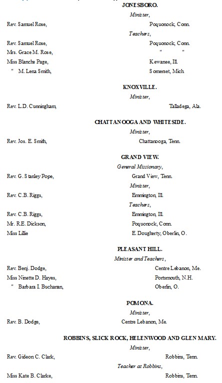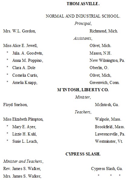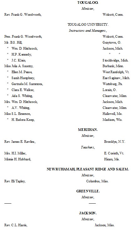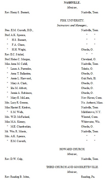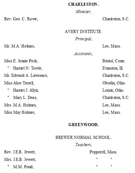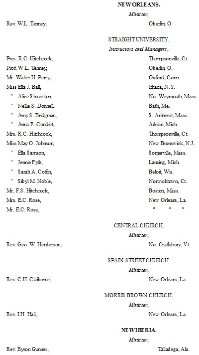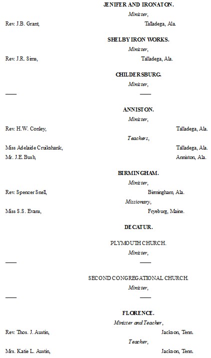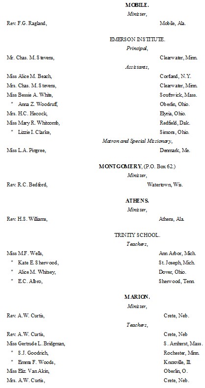 The following list presents the names and post-office addresses of those who are employed in the Churches, Institutions and Schools aided by the American Missionary Association.