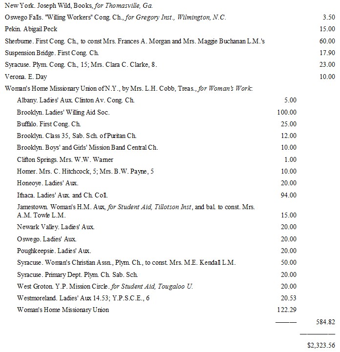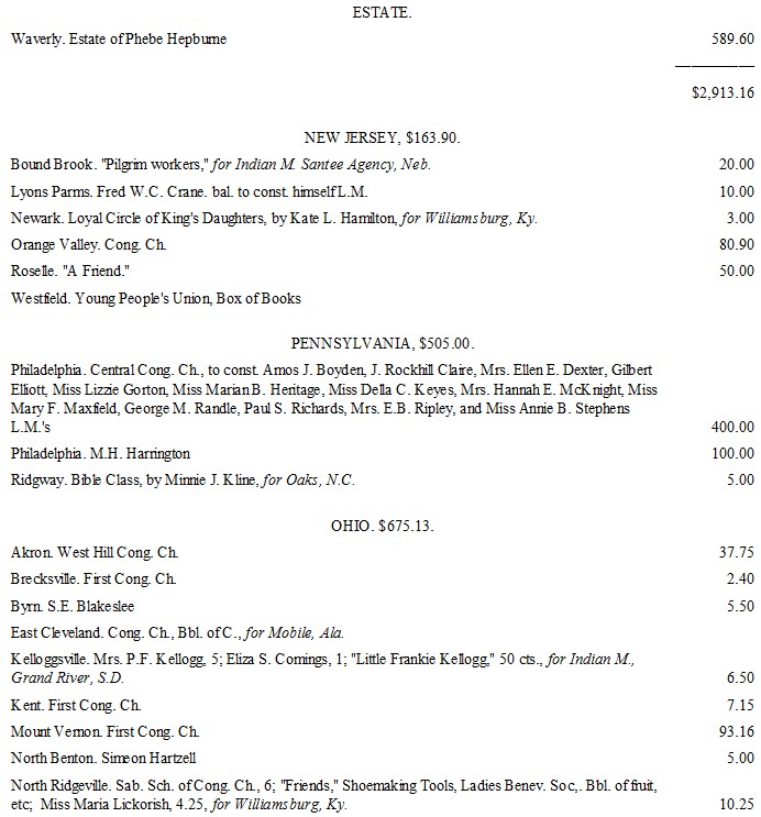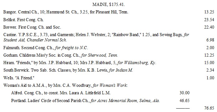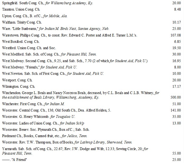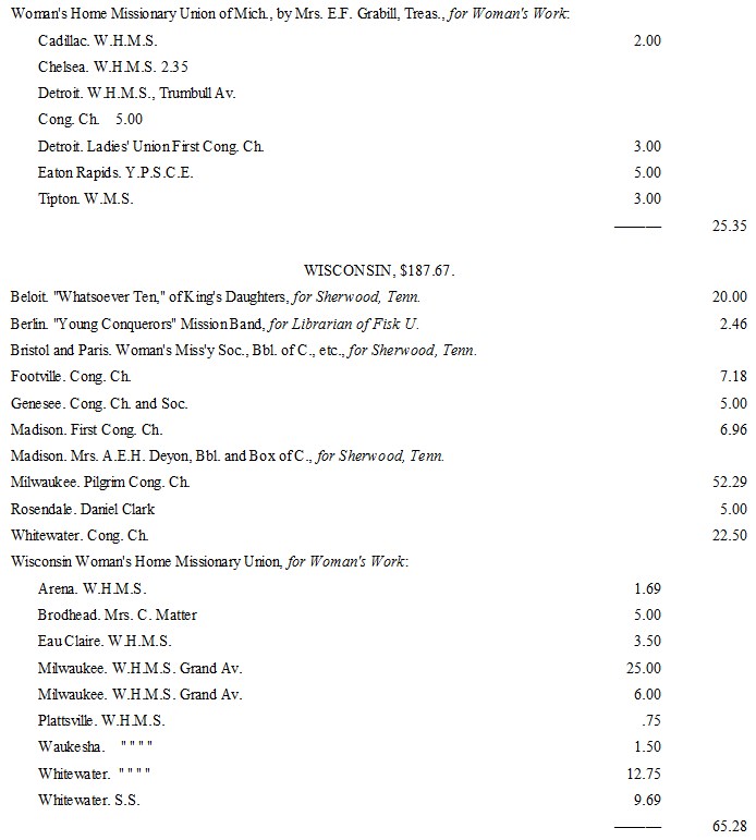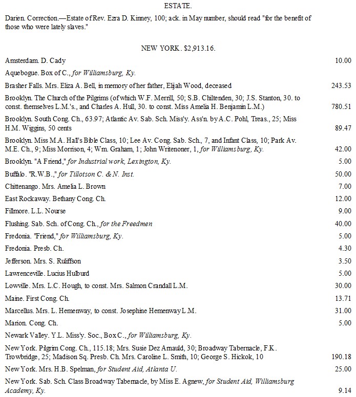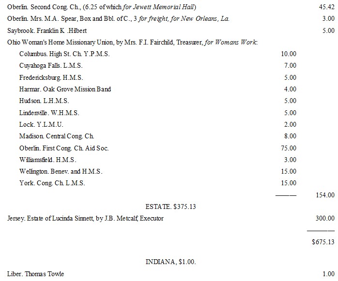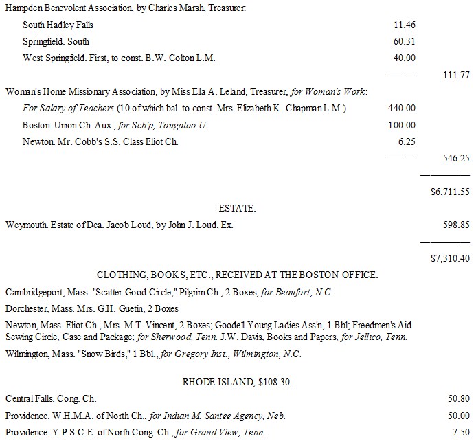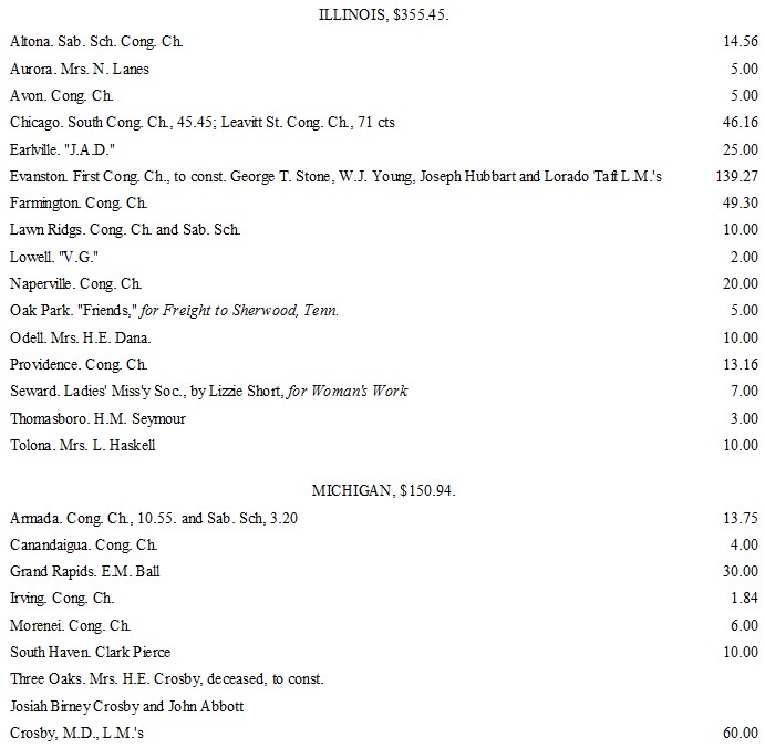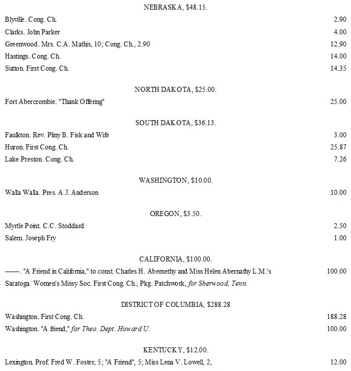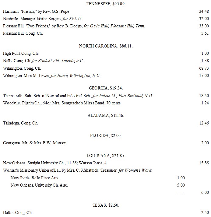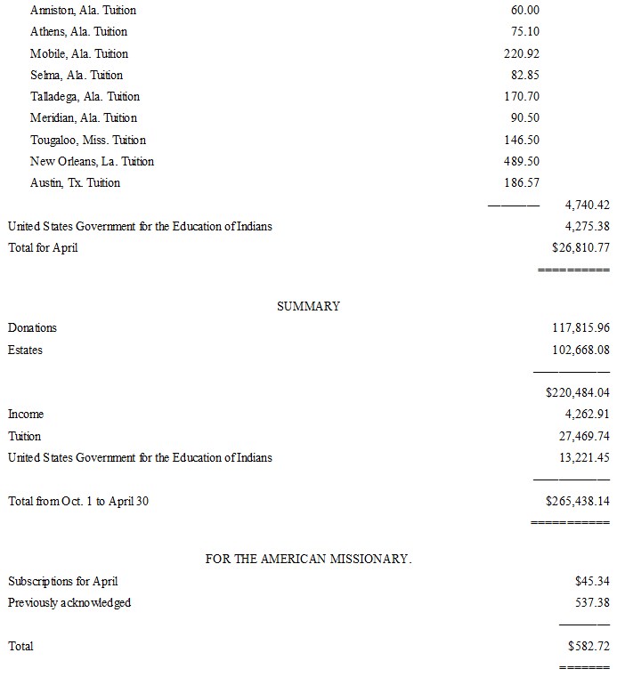 We would suggest to all ladies connected with the auxiliaries of State Missionary Unions, that funds for the American Missionary Association be sent to use through the treasurers of the Union. Care, however, should be taken to designate the money as for the American Missionary Association, since undesignated funds will not reach us.