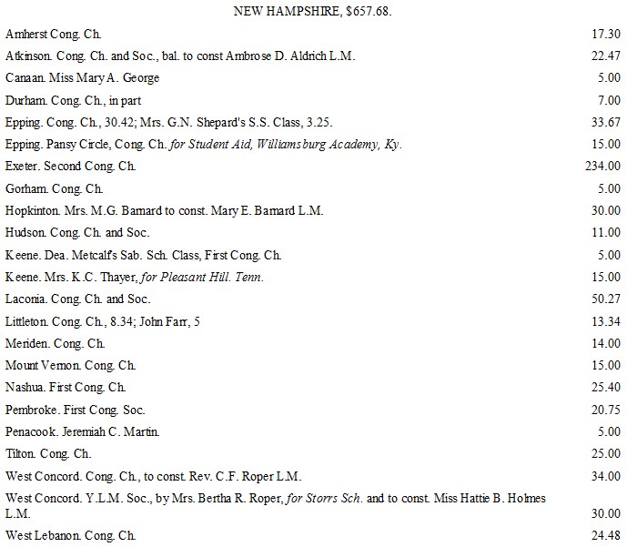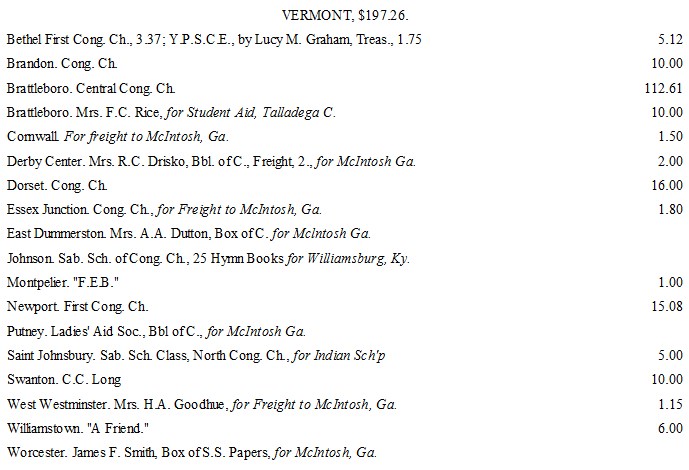 Co-operating with the American Missionary AssociationMAINEWoman's Aid to A.M.AChairman of Committee—Mrs. C.A. Woodbury, Woodfords, MeVERMONTWoman's Home Missionary UnionPresident—Mrs. A.B. Swift, 167 King St., Burlington.