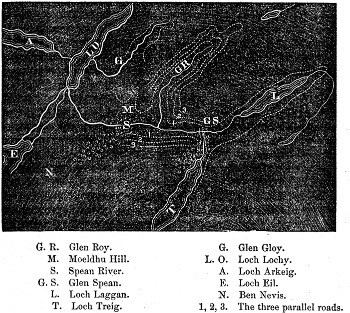 And now, if it be asked how much of this evidence for the former existence of glaciers is to be found in Great Britain, I answer, that there is not a valley in Switzerland where all these traces are found in greater perfection than in the valleys of the Scotch Highlands, or of the mountains of Ireland and Wales, or of the lake-region in England. Not a link is wanting to the chain. Polished surfaces, traversed by striæ, grooves, and furrows, with a sheet of drift resting immediately upon them, extend throughout the realm,—the roches moutonnées raise their rounded backs from the ground there as in Switzerland,—transverse moraines bar their valleys and lateral ones border them, and the boulders from the hill-sides are scattered over the plains as thickly as between the Alps and the Jura, and are here and there perched upon the summits of isolated hills. This being the case, let us examine a little more closely the local phenomena connected with the ancient extension of glaciers in this region, and especially the parallel roads of Glen Roy.