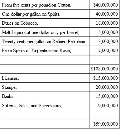 "The diffuseness of the present revenue system of the United States is doubtless one of its greatest imperfections, and under it the exemption of any article from taxation is the exception rather than the rule. To assert this, however, is no reflection on the judgment or skill of its authors. The system was framed under circumstances of such pressing necessity as to afford but little opportunity for any careful and accurate investigation of the sources of revenue; but it has most certainly accomplished the end designed, namely, the raising of revenue; and the country to-day is undoubtedly receiving by taxation far more revenue than is necessary for its legitimate expenditures. As a success, therefore, our present revenue system is a most honorable testimonial, not only to the wisdom of its authors, but to the patriotism of the people, who not only endured, but welcomed, the burdens it imposed upon them.