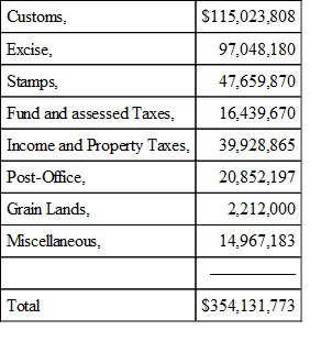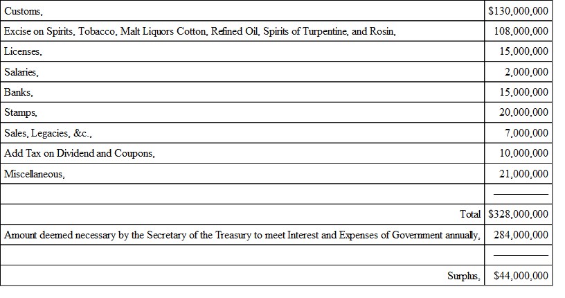 They thus provide a revenue of $318,000,000, or $30,000,000 more than that required by the Secretary,—a surplus which, with the annual excess of duties, to say nothing of the future growth of revenue, would extinguish our debt in little more than thirty years. But to guard against all contingencies, they propose to levy on incomes taxes to the amount of $40,000,000; and on the gross receipts of railways, bridges, canals, and stages, $9,000,000. These change the aggregate to $367,000,000; an excess of $81,000,000 over the estimate of our requirements by the Secretary.