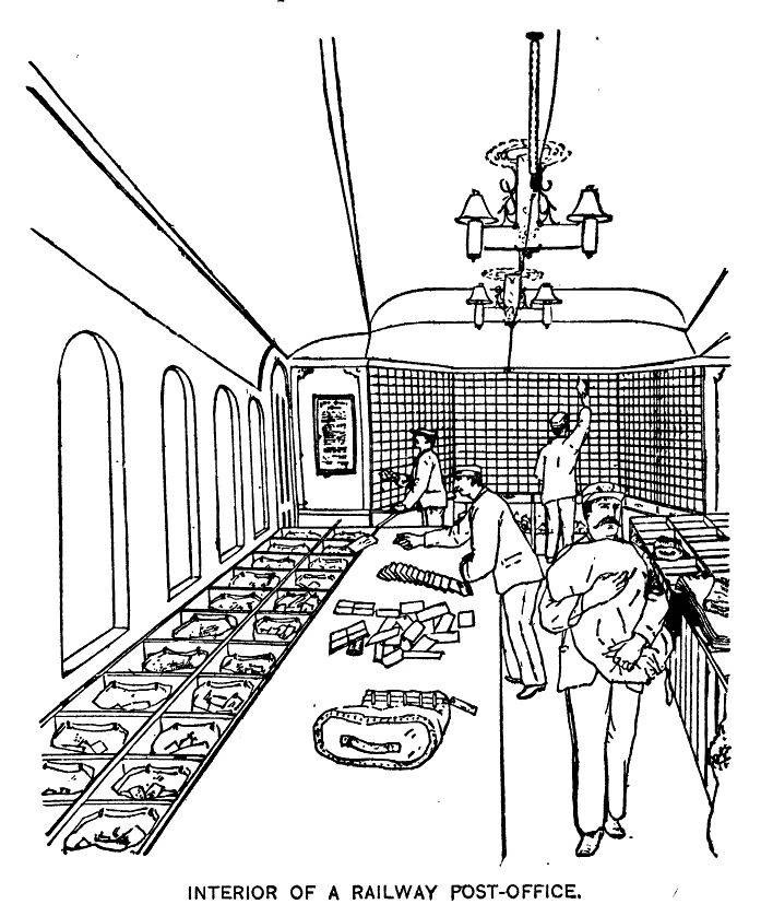 The interior dimensions of postal-cars vary, from whole cars sixty feet in length, to apartments five feet five inches in length by two feet six inches in width. The most comprehensive conception of the practical working of the postal-car system, can be formed in a railway post-office from forty to sixty feet in length; with this in view, we will make a trip in one. A permit to ride in the car, signed by the superintendent of the division of the service, is necessary to allow us the privilege; and it is also required of clerks belonging to other lines. This rule is necessary, in order that the clerks may perform their work uninterruptedly and correctly; and also to exclude unauthorized persons from mail apartments. After a hasty exchange of salutations with the four clerks, the "clerk in charge" notes our names on his "trip report," and we are assigned a spot in the contracted space, where, we are assured, we will be undisturbed, at least for a while. The trip report mentioned is used in noting connections missed, and other irregularities that may occur. The interior of the car is fitted up with a carefully-studied economy of space, upon plans made under the supervision of the superintendent of the division, or chief clerk of the line. Occupying one end of the car are cases of pigeon-holes, or boxes, numbering from six hundred to one thousand, arranged in the shape of a horse-shoe, for the distribution of letters. These boxes are labeled with the names of the post-offices on the line of road, connecting lines, States, and prominent cities and towns throughout the country. A long, narrow aisle passes through the centre of the car, on both sides of which are racks for open sacks and pouches, into which packages of letters and pieces of other mail matter are thrown; on the sides above are rows of suspended pouches, with their hungry mouths open. By this plan, in this contracted space, upwards of two hundred different pouches and sacks can be distributed into between the termini. On one side of the aisle is a narrow counter, upon which the mail matter is emptied from the pouches and sacks; this is hinged to the pouch-rack, and can be swung back, to enable the clerks to get at the pouches more easily. The space beyond, divided by stanchions, is for the stowage of mails, and for their separation into piles.