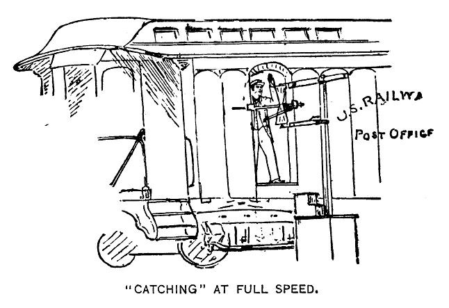 When the pouch is snatched from the crane, the top piece flies up as described, and a parallel short joist at the bottom of the pouch drops. The pouch is strapped small in the middle, resembling an hour-glass, where the catcher-iron on the car is to strike it. This "catcher" consists of a round iron bar across the door of the car, and placed in a socket on each side about shoulder high; a strong handle, similar to a chisel-handle, projects perpendicularly from this bar; on the under side of the bar projects, at an angle of about forty-five degrees, a slender and strong iron rod, slightly turned at the end to prevent its tearing the pouch, of about three feet in length. As the train approaches the crane, the operating clerk with a quick, steady throw delivers the mail at a given point, usually near the crane; he then grasps the handle with his right hand, swinging the handle over inward; the arm when thrown outward, the horizontal bar turning in the sockets, comes in contact with the pouch, striking that part of it narrowed by the strap and striking the arm near the vertex of the angle into which it is driven by the momentum of the train; the greater the speed the more securely it is held there; but the clerk is on the qui vive, and as soon as it strikes the catcher-iron, grasps the pouch to make sure of getting it, as sometimes if the pouch is not hung properly, the arm will strike it at such a part as to require the most agile movement on the part of the clerk to secure it and to prevent its falling to the ground or under the wheels of the train and being torn to pieces; these cases, however, are rare, but pouches have lodged on the trucks and have been carried many miles.