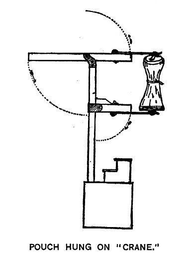 The manner of taking or "catching" the mail from the trackside by some invisible power on a railroad train plunging through space has seemed to many a feat of almost legerdemanic skill, when all that is required is a simple mechanical apparatus and a quick, firm movement of the arm in using it at the right moment. A crane similar in appearance to the oldtime gibbet is erected near the track, and may have served as a warning by its suggestive appearance to some would-be train-wrecker. Its base is a platform two feet and a half square, with two short steps on top to assist the person hanging the pouch; a post ten feet in height passes up through this platform near the edge; a stout joist about five feet in length is fixed across the top of the post and so balanced that when relieved of the weight of the pouch it flies up perpendicularly against the post. The pouch used for this purpose is made of canvas and is somewhat narrower than the ordinary leathern pouch. It is lightly suspended by a slender iron rod projecting from the horizontal joist, passed through a ring at the top and lightly held at the bottom in the same manner as at the top.
