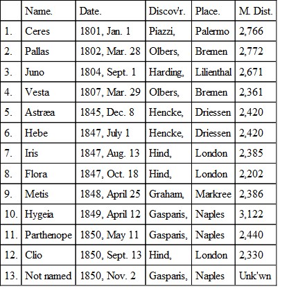 It appears that of these thirteen Asteroids, three have been discovered by Hind of London, three by Gasparis of Naples, two by Hencke of Driessen, two by Olbers of Bremen, while Piazzi of Palermo, Harding of Lilienthal, and Graham of Markree, have each discovered one. Eight out of the twelve orbits ascertained have an inclination of less than ten degrees. The London Athenæum states that the Lalande Medal of the Paris Academy of Sciences has been awarded to M. de Gasparis for his discovery of the planet Hygeia. The prize for 1850 was shared between Gasparis for his two discoveries in November, and Mr. Hind for his discovery of Clio on the 13th of September.
