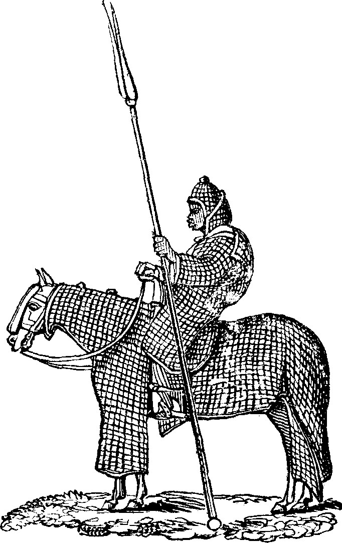 The second engraving, copied from the same authentic source as that preceding it, is a somewhat grotesque portraiture of one of the Lancers of the Sultan of Begharmi, described, in an historical and geographical account by a native prince, as an extensive country, containing woods and rivers, and fields fit for cultivation; but now desolated, as the inhabitants say, by the "misconduct of the king, who, having increased in levity and licentiousness to such a frightful degree, as even to marry his own daughter, God Almighty caused Saboon, the prince of Wa-da-i, to march against him, and destroy him, laying waste, at the same time, all his country, and leaving the houses uninhabited, as a signal chastisement for his impiety."
