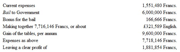 or about £78,244 English! And yet, in spite of this unanswerable logic of figures and facts, there are every day fresh victims who are infatuated enough to believe that it is possible to counterbalance the advantages which the bank possesses, by a judicious management of the power the player has of altering his stake! The revenue formerly paid to the government for licenses, has recently been transferred to the city of Paris.