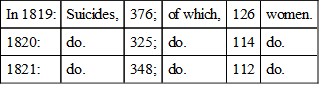 Of the suicides of these three years 25, 50, and 36, were attributed to love, and 52, 42, 43, to despair arising from gaming, the lottery, &c. In the winter of 1826, several exaggerated losses by gaming were circulated in Paris with great finesse, to enable bankrupts to account for their deficiencies, many of whom were exposed and deservedly punished.