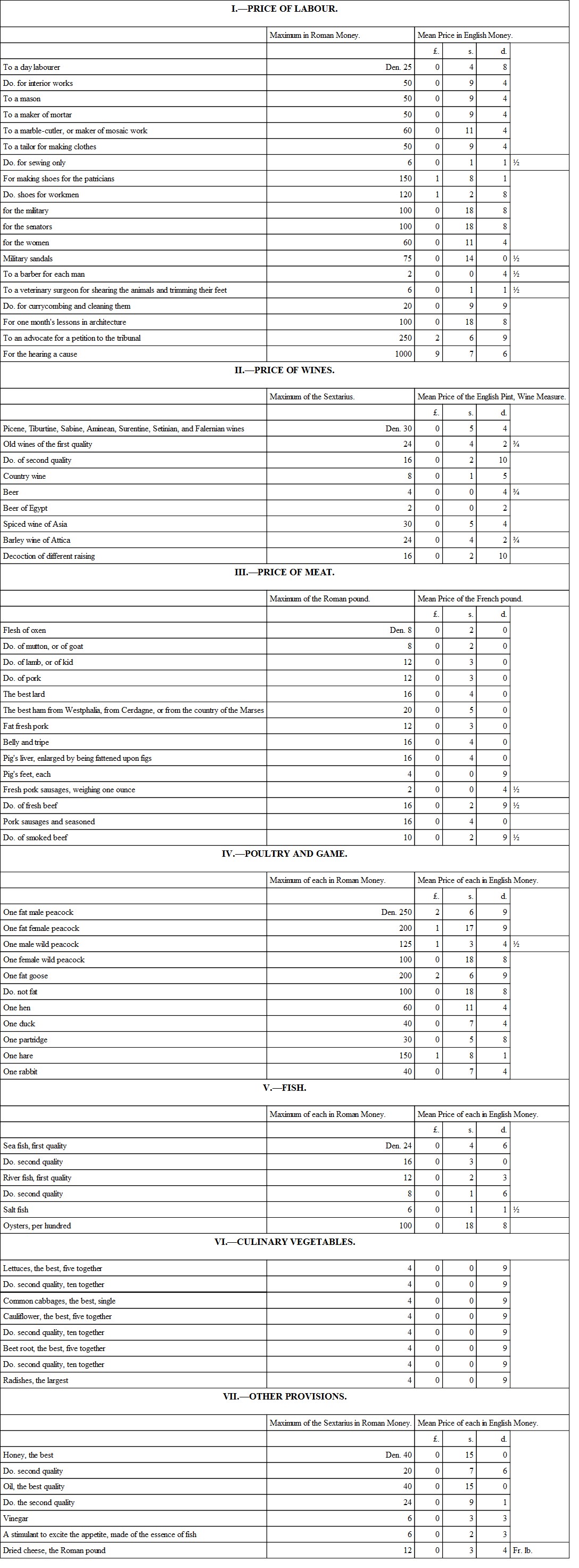 The imperial edict of Diocletian is composed of more than twenty-four articles. It is quite distinct from that delivered the preceding year for taxing the price of corn in the eastern provinces, and it contained no law upon the value of corn. It fixed for all the articles which it enumerated a maximum, which was the price in times of scarcity. For all the established prices it makes use of the Roman Denarii; and it applies them to the sextarius for liquids, and to the Roman pound for the things sold by weight.