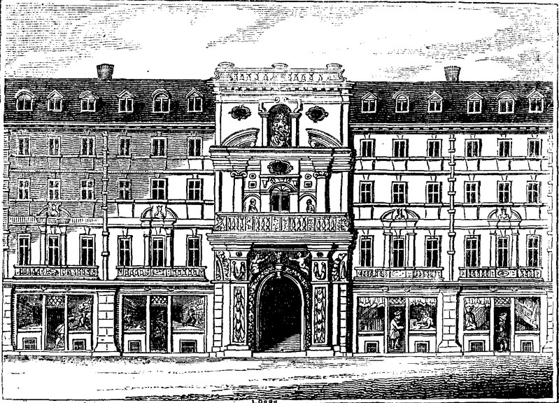 Nearly opposite the entrance to Mercers' Hall, is a handsome stone-fronted house, built by Sir Christopher Wren. The houses adjoining the Hall were of similar ornamental character; although the unenclosed shop-fronts present a strange contrast with some of the improvements and superfluities of modern times. The Hall front has lately been renovated, and presents a rich display of architectural ornament.