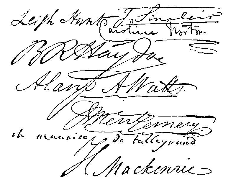 CH. MAURICE DE TALLEYRAND—whose life will hereafter be traced throughout a volume of the history of the last and present century. His age is 77. This signature is copied from the Frontispiece to the last edition to the Court and Camp of Bonaparte, in the Family Library, which is a fine portrait of Talleyrand, engraved by Finden, from a picture by Girard.