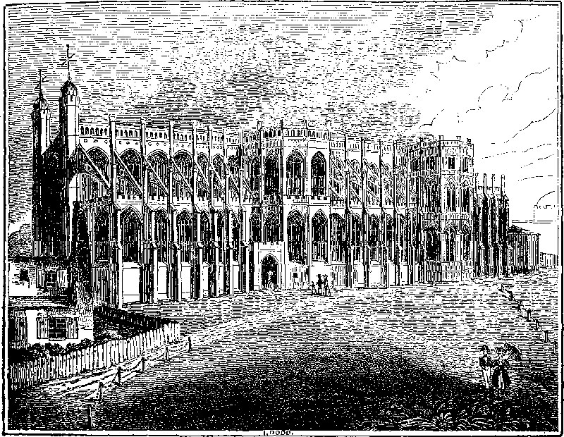 This venerable structure, as we explained in No. 486 of The Mirror, is situated in the lower ward or court of Windsor Castle. It stands in the centre, and in a manner, divides the court into two parts. On the north or inner side are the houses and apartments of the Dean and Canons of St. George's Chapel, with those of the minor canons, clerks, and other officers; and on the south and west sides of the outer part are the houses of the Poor Knights of Windsor.