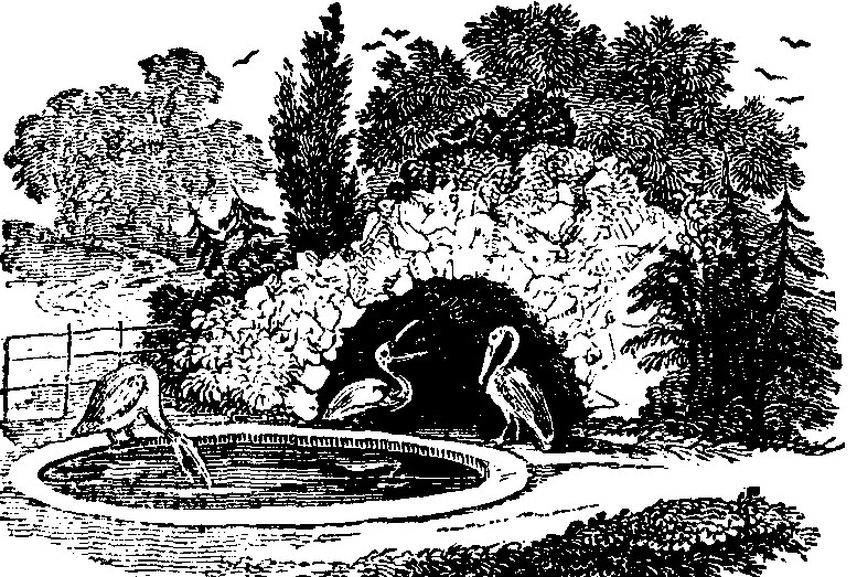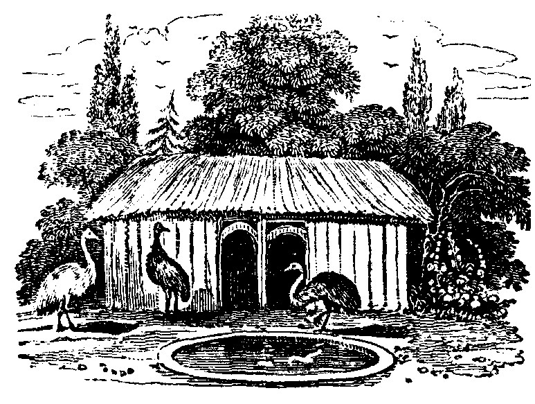Our strolls to this scene of intellectual amusement, (or "the gardens with a long name," as Lord Mulgrave's new heroine naively calls them,) are neither few nor far between. The acquaintance is of some standing, since The Mirror was the first journal that contained any pictorial representation of these Gardens, or any connected notice of the animals.1 At that time the Society had not published their "List," and our twopenny guide was common in the hands of visiters. We do not ask for the thanks of the Council in contributing to their annual receipts, now usually amounting to £10,000.: we were studying the interest of our readers, which uniformly brings its own reward. The first of the present illustrations is the Emu Enclosure, in the old Garden. Several broods of Emus have been reared by the Society at their Farm at Kingston Hill; and some of the year's birds are usually exhibited here. Next is the Pelican Enclosure, containing a house of mimic rock-work, and a capacious tank of water, the favourite element of the Pelican. One pair in mature plumage, and a second pair, supposed to be the young of the same species, are exhibited. The third Cut is the Aviary for small and middle-sized birds, at the north-eastern corner of the Garden. Here are kept various British Birds, as the different species of Crows and Song Birds. The bamboo ornaments of the building are not, therefore, of the appropriate character that we so much admire elsewhere in the Gardens.