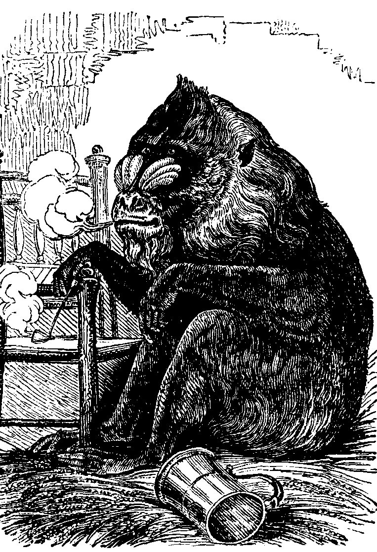 Jerry is now a member of death's "antic court," but his necrology may be interesting to the reader. Mr. Cross describes him as "from on board a slave vessel that had been captured off the Gold Coast, in the year 1815," when he was supposed to be three years old. He was landed at Bristol, and was there purchased by the proprietor of a travelling menagerie, who kept him for some years, and taught him the various accomplishments he after excelled in, as sitting in a chair, smoking, drinking grog, &c.; probably he required but little tuition in the latter; since we find a fondness for fermented liquors numbered among his habits by the biographers of his species. In 1828, Jerry was purchased by Mr. Cross, and exhibited at the King's Mews, when he appeared in full vigour, and attracted a large number of daily visitors. He was fed daily from the table of his owner, and almost made a parlour guest; taking tea, toast, bread and butter, soup, boiled and roast meats, vegetables, pastry, &c., with as much gout as any member of a club in his vicinity. In 1829, his eccentricities reached the royal ear at Windsor, and George the Fourth, (whose partiality to exotics, animate or inanimate, was well known,) sent an "express command" that Jerry should attend at the Castle. The invitations of royalty are always undeclinable, and Jerry obeyed accordingly. The King was much amused with his visiter, and, says our informant, "his Majesty was delighted at seeing him eat the state dinner, consisting of venison, &c., which had been prepared for him."2 Thus, Jerry was not in the parlous state described by Touchstone: he was not damned, like the poor shepherd: he had been to court. He had also learnt good and gallant manners. He recognised many of his frequent visiters, and if any female among them was laid hold of, in his presence, he would bristle with rage, strike the bars of his cage with tremendous force, and violently gnash his teeth at the ungallant offender.