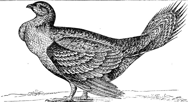 "The flight of these birds is slow, unsteady, and affords but little amusement to the sportsman. From the disproportionately small, convex, thin-quilled, wing,—so thin, that a vacant space, half as broad as a quill appears between each,—the flight may be said to be a sort of fluttering more than any thing else: the bird giving two or three claps of the wings in quick succession, at the same time hurriedly rising; then shooting or floating, swinging from side to side, gradually falling, and thus producing a clapping, whirring sound. When started, the voice is 'cuck, cuck, cuck,' like the common pheasant. They pair in March and April. The love-song is a confined, grating, but not offensively disagreeable, tone,—something that we can imitate, but have a difficulty in expressing—'Hurr-hurr—hurr-r-r-r hoo,' ending in a deep hollow tone, not unlike the sound produced by blowing into a large reed. Nest on the ground, under the shade of Purshia and Artemisia, or near streams, among Phalaris arundinacea, carefully constructed of dry grass, and slender twigs. Eggs from thirteen to seventeen, about the size of those of a common fowl, of a wood-brown colour, with irregular chocolate blotches on the thick end. The young leave the nest a few hours after they are hatched. In the summer and autumn months these birds are seen in small troops, and in winter and spring in flocks of several hundreds. Plentiful through the barren arid plains of the river Colombia; also in the interior of North California. They do not exist on the banks of the river Missouri; nor have they been seen in any place east of the Rocky Mountains."