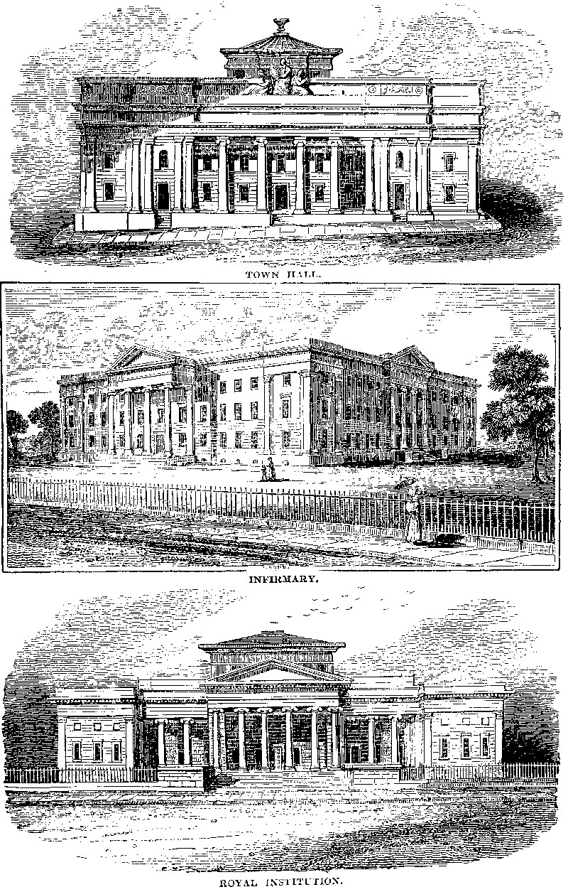 Embracing a variety of objects connected with the pursuits of literature and science, and the cultivation of the fine arts, originated with a few public-spirited individuals, in the year 1823, and was soon honoured with the public, and finally, with royal, patronage, The building, which has been erected from a design by Mr. Barry, of London, and is of a durable and richly-coloured stone, from the vicinity of Colne, forms a splendid addition to the architectural ornaments of the town. It is in the Grecian style. The principal elevation, (seen in the Engraving) towards Mosley-street, has a noble portico of six lofty columns of the Ionic order, supporting a rich entablature and pediment in the centre, on each side of which are columns and pilasters connecting it with the wings. Above the doors and windows are panels for bas-reliefs symbolical of the design of the Institution: the attic story of the hall has been recently, or is to be, surmounted by a finely-sculptured figure of Minerva. The area round the building is enclosed with a handsome iron palisade on a lofty plinth of masonry, with pedestals at the angles of the steps leading to the portico and side entrances. The centre comprises the Hall and the Theatre; one of the wings is appropriated as an Academy of the Fine Arts, with exhibition rooms, and the other as a Museum of Natural History. The Hall which is wholly lighted from the attic story, is 40 feet square, and 60 feet high; it contains a grand staircase of stone, consisting of central and lateral nights, with pedestals for sculptures, leading to a gallery on three sides of the hall, supported on Doric pillars; and to the theatre, which is of a semicircular form. On the gallery are entrances on each side leading through corridors flanked with columns, into the exhibition-rooms in each wing of the building; the ceiling of the Hall is richly-paneled in deeply-recessed compartments, and beneath the attic windows is a rich frieze for bas-reliefs. The Theatre will hold 600 persons, has a gallery supported on columns of bronze, and the walls are decorated with engaged columns, and with isolated columns in the angles: the ceiling is richly paneled, and the theatre is lighted by a lantern, which, by machinery, may be darkened instantaneously, at the will of the lecturer. There are three exhibition rooms in each wing, which may be thrown into one. There are also various rooms for the use of officers and others connected with the Institution, to which access is obtained from the hall and other parts of the building. The whole cost of this elegant pile is stated at about 50,000l. The Institution is under the direction of a President, twelve vice-presidents, and a committee, chosen from a body of nearly 700 hereditary and life governors, of whom the former are contributors of forty, and the latter of twenty-five guineas each.