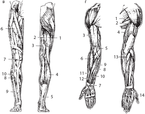 Рис. 9–2. Мышцы человека: в – мышцы нижней конечности: 1 – двуглавая мышца бедра; 2 – полу сухожильная мышца; 3 – полуперепончатая мышца; 4 – икроножная мышца; 5 – пяточное сухожилие; 6 – четырехглавая мышца бедра; 7 – собственная связка надколенника; 8 – передняя большеберцовая мышца; 9 – длинный разгибатель пальцев; 10 – длинная малоберцовая мышца; г – мышцы верхней конечности: 1 – малая круглая мышца; 2 – большая круглая мышца; 3 – двуглавая мышца плеча; 4 – трехглавая мышца плеча; 5 – плечевая мышца; 6 – плечелучевая мышца; 7 – сухожилие поверхностного сгибателя пальцев; 8, 10 – поверхностный сгибатель пальцев; 9 – лучевой сгибатель кисти; 11 – лучевой сгибатель запястья; 12 – сухожилие лучевого сгибателя кисти; 13 – локтевая мышца; 14 – короткий разгибатель большого пальца кисти